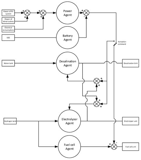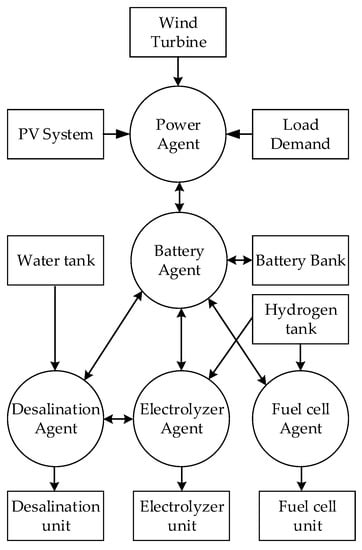 A MAS was used to represent the different characteristics of each component of the microgrid and their interaction in the microgrid. The MAS of the microgrid consisted of five intelligent agents and the Percepts, Actions, Goals and the Environment (PAGE) where the agents act are presented in Table 2. The five agents of the microgrid were the Power agent, the Battery agent, the Desalination agent, the Electrolyzer agent and the Fuel cell agent. In this MAS, each agent has different goals and the DEMS make decisions in order to meet the variable energy conditions such as the intermittency of renewable energy sources (RES) and to fulfil the load, potable water and fuel for transportation demands. The objective of MAS-DEMS is the effective operation of microgrid through the optimal usage of the distributed energy generation sources and storage units. The topology of MAS is presented in Figure 2. Figure 3 illustrates the DEMS blog diagram of the MAS-DEMS architecture.