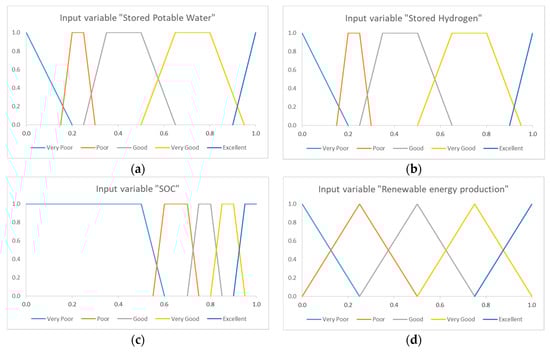 Membership curves for each input: (a) Stored Potable Water; (b) Stored Hydrogen; (c) SOC and (d) Renewable energy production.