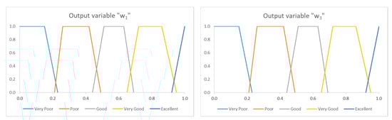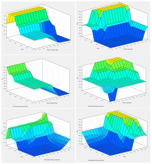 Since the fuzzy logic system has been developed, and can be calculated. They are numerical values which correspond to a fuzzy set and they are ranging from zero to one. The input variables “Stored Potable Water”, “SOC” and “Renewable energy production” used for the weight . The same input variables with one exception used for the weight . The exception is that instead of “Stored Potable Water”, the input variable “Stored Hydrogen” is considered. Figure 5 shows the membership functions of the outputs. All the membership functions of the fuzzy logic routines were designed using the control surfaces (Figure 6) based on the experience of the research team. The rules for each of the routines were developed based on the previous knowledge and the experience of the members of the research team [].