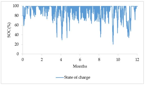 The Battery agent was a simple reflex-agent which represents the battery bank. This agent took as input the state of charge (SOC) of the battery bank at any time step and controls the charging and discharging of the battery bank. The preference of this agent was to cover the load demand when the RES could not provide enough power and to protect the battery bank which depends directly to the battery SOC. The SOC should be kept between a minimum and maximum limit (Equation (2)). In this study, minimum depth of discharge (DOD) of the battery bank was set at 20% (Equation (3)) []: