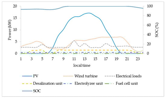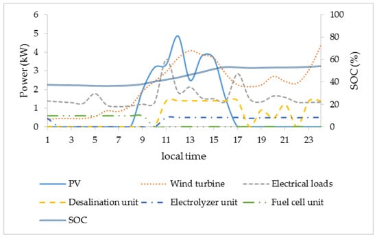 where Ppv is the average power generation of the PVs for a time period of one hour, Pwind is the average power generation of the wind turbine for a time period of one hour, Pload is the average electrical power demand for a time period of one hour and t is the time period and it is equal to one hour (1 h).
