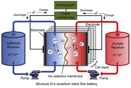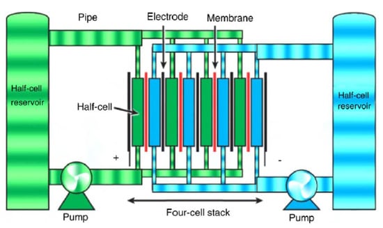 50]. The schematic diagram of the structure of a flow battery is shown in