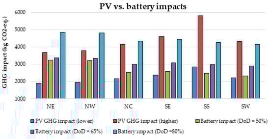 Furthermore, there is currently an increased use of batteries than ever due to the widespread application of renewable energy systems around the world. As a result, the issue of environmental risk and the potential hazard to human health by the use of batteries is very crucial in the energy system field of practice. This is because some of the battery materials are toxic, e.g., lead, cadmium etc. Therefore, efforts have been made in this paper to examine the environmental impact of batteries in a renewable energy system, using a 1.5 kW stand-alone solar PV system as a case study. The energy system was considered for 6 different locations in Nigeria and the GHG impact was estimated based on the life cycle emission rate reported in the literature. The results demonstrate that the battery has a significant impact in the off-grid PV system, achieving GHG impact of about 36–68% in the PV system for battery depth of discharge (DoD) values of 50–80%.