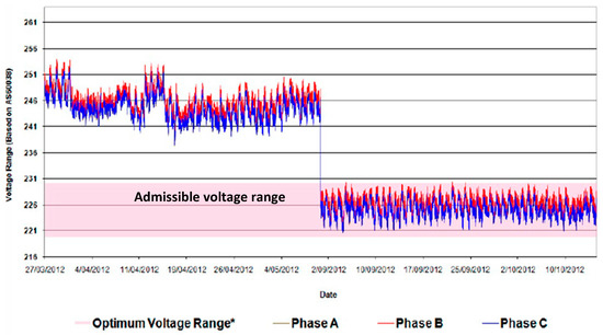 Voltage profile across three-phase, pre- and post-installation of voltage optimisation technology (obtained from [18], with permission from Energywise, 2017).