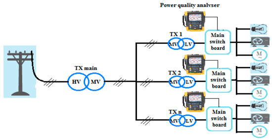 A power quality analyser (Fluke 435 Series II Power Quality and Energy Analyzer) [23] was installed, as shown in Figure 5, at each of the transformers on-site for a week to measure the electricity data at 1-min intervals. Monitoring was undertaken over a four-week period leading up to (Tx_1, Tx-2 and Tx_6), and just after (Tx_3) Christmas, as this is the busiest time of year for the abattoir, when the electrical equipment will be under most load. The electricity data collected from the individual transformers were phase and line voltages, phase and line currents, active power (per-phase and total), reactive power (per-phase and total), apparent power (per-phase and total), voltage and current unbalances, power factor, THD, and a number of other relevant parameters.