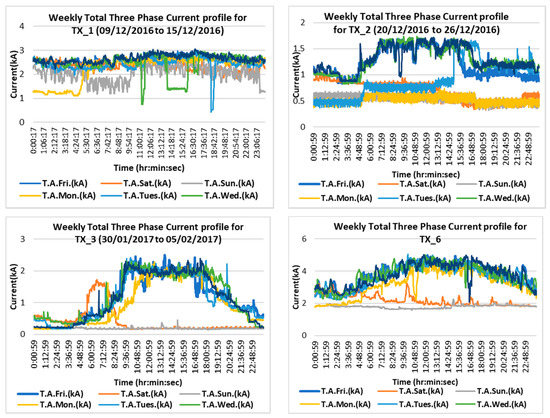 Weekly current profiles for refrigeration (TX_1), kill floor (TX_2), by-products (TX_3) and general distribution (TX_6) feeder transformers.