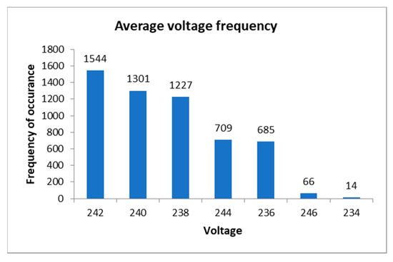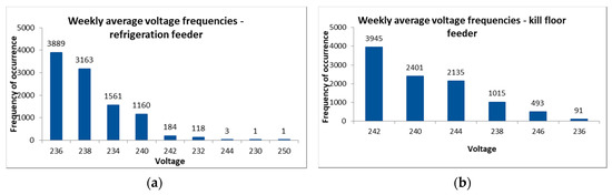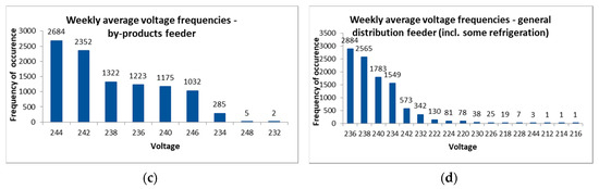 Figure 8a–d presents the weekly voltage frequencies for each transformer. Figure 8 shows that voltage levels between 236 V and 238 V are dominant for the general distribution (Figure 8d) and refrigeration (Figure 8a) transformers. However, for the kill floor and by-products transformers, voltage levels of 240 V and above are more dominant, as shown in Figure 8b,c, respectively.