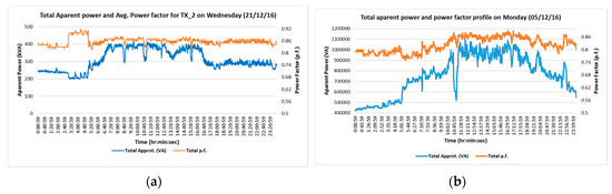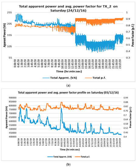 Figure 10 shows the three-phase average p.f. and three-phase total apparent power of two transformers that demonstrated typical characteristics on Saturday. The p.f. profiles of both TX_2 (Figure 10a) and TX_6 (Figure 10b) are less than 0.8 for most of the time and as a result the cost of electricity will be higher. Considering the lower power factors, these transformers would be optimal for the application of VO, as by reducing kVAr, the VO can also improve the p.f. to some extent.