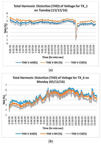 THD is related to either current harmonics or voltage harmonics, and is defined as the ratio of the sum of the power of all harmonic components to the power of the fundamental frequency. The THD measurement of the refrigeration (TX_1) and general distribution (TX_6) transformers during typical weekdays at the case study site showed that the THD values are within the recommended limits of 8% [28] on the low voltage side. TX_1 (Figure 11a) has higher THD than TX_6 (Figure 11b) due to the refrigeration loads, as shown in Figure 11. The measurements also showed that the level of total harmonic distortion is quite low on a typical weekend day relative to the weekdays, which is expected as there are less loads on the weekend.