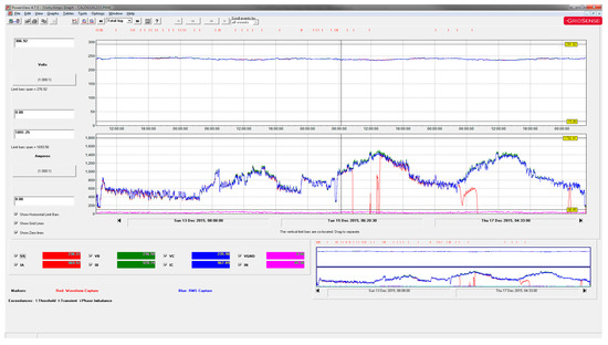 The data was collected from the Case Study 2 site using a Powermonic PM45 [29] and included voltage and current across three phases from 12 December 2015 to 17 December 2015, again in the busiest period leading up to Christmas. The data were collected from the incoming on-site transformer of 1 MVA capacity that feeds the main switchboard. Figure 12 shows the voltage and current profile over a three-day period.
