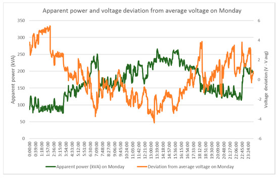 Voltage deviation from the average supply voltage for the whole site in Queensland is shown in Figure 13, which shows very similar weekday profiles. High voltages are observed in the network from midnight to early morning and sunset to midnight due to less loading, while lower voltages are observed during daytime due to high loading in the abattoir. On the other hand, the weekend profile fluctuates with time due to the number of connected loads in the network. Figure 14 shows the average apparent power and voltage deviations on Monday, where lower voltages are observed with the increase of load demand and higher voltage with the decrease of load demand in the abattoir. From the frequency distribution, as shown in Figure 15, it is seen that 41% of the time site voltages are more than the nominal voltage of 240 V and, hence, more energy and costs savings will be possible from this site through the use of VO technology.