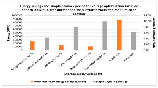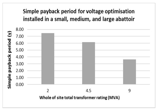 The analysis for Case Study Site 1 showed that, if 230 V could be supplied and maintained for one main transformer alone, then annual energy and cost savings could potentially be 70,348 kWh. The analysis for Case Study Site 2 showed that maintaining the voltage level at 230 V for the site as a whole could potentially save 122,758 kWh annually. Apart from the savings in energy, other benefits include less stress on electrical equipment and therefore improved lifetimes with less maintenance, as well as (depending on the technology used) improved power factors and less loss due to harmonics. The economic analysis has shown that, for a typical mid-sized (600 head a day) abattoir with a supply voltage of 240 volts and an electricity price of AU $0.15 a kWh, the installation of a voltage optimiser will have a payback period of 3–6 years, depending on the supply voltage, type of feeder line, and number of VSDs installed. Due to their larger electricity consumption, larger abattoirs will have a lower payback period, as will the use of voltage optimisers on individual large electricity feeder lines, such as refrigeration, compared to the whole site. The use of dynamic voltage optimisation is more economically favourable than using voltage reduction.