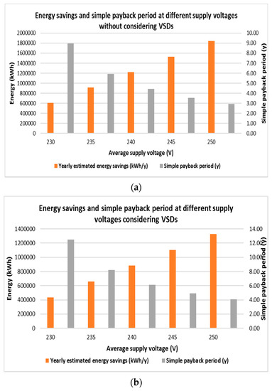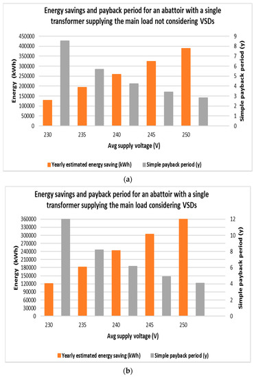 Annual energy savings and simple payback period when applying dynamic voltage optimisation with a set voltage of 220 V installed at a medium-sized abattoir: (a) without considering; and (b) with considering the effect of VSDs on the load for a range of supply voltages.