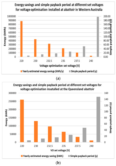 The energy savings and simple payback periods of installing voltage optimisation with a set voltage of 220 V at a medium sized abattoir is given in Figure 17a, where the effect of VSDs in the load is not considered, and Figure 17b, where the effect of VSDs on voltage optimisation is considered. Based on the types of VSDs typically used, the energy savings from voltage optimisation applied loads with VSDs is estimated to be 35% less than loads without VSDs in this analysis. On the other hand, Figure 18a,b represents the energy savings and payback period for a single transformer supplying the main load (1 MVA transformer) at the abattoir in Queensland with or without VSD, respectively. Energy savings and simple payback period for the abattoirs at WA and QLD are shown in Figure 19a,b, respectively, with different VO set voltages for a supply voltage of 240 V. From the figures, it is evident, as expected, that the highest energy savings and the lowest payback period can be achieved with a VO set voltage of 220 V. Conversely, the lowest energy savings and the highest payback period is for a VO set voltage of 240 V.