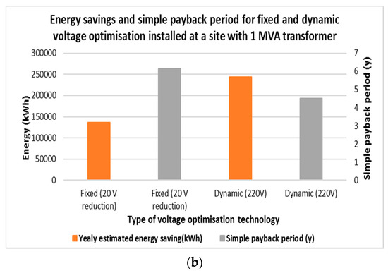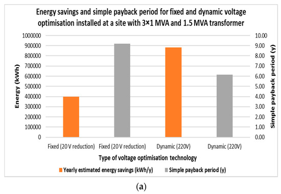 Annual energy savings and simple payback period when applying dynamic voltage optimisation (1 MVA unit) with a set voltage of 220 V installed at an abattoir supplying the main load: (a) without considering; and (b) with considering the effect of VSDs.
