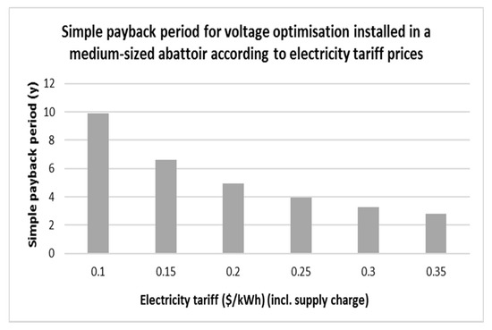 Simple payback period when applying dynamic voltage optimisation with a set voltage of 220 V installed at a medium-sized abattoir for a range of electricity tariffs.