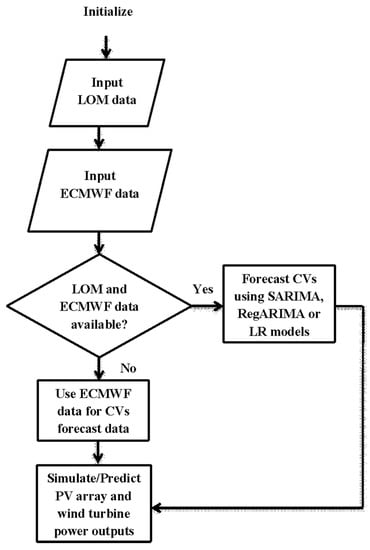 The climatic variables used as inputs for the REμG model selection process are such that in locations where there is no access to local meteorological data, the ECMWF forecasts will be solely utilized in the absence of a localized calibration technique (using close proximity empirical meteorological data). In locations where local meteorological data are available, DSTREM users can generate their own climatic variable forecast, solely using empirical data and SARIMA models, or using both ECMWF forecast and empirical data with LR or RegARIMA modeling techniques. A major characteristic of the regression models (LR and RegARIMA) is that they map the relationship between ECMWF forecasts and the corresponding local data, while the SARIMA model’s major characteristic is that it generates forecasts based on the historical patterns in the localized empirical data. Hence, the methodology described in this paper is portable and could potentially be used anywhere in the world. Figure 1 illustrates the REμG climate variable input selection process. Where CV denotes climate variable and LOM represents locally obtained meteorological data.