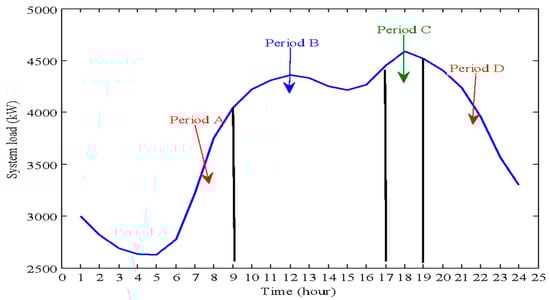 To compare the monetary benefits produced by different FITs to DSTREM users, the smart grid model explored three different FITs. Greater monetary benefits are achieved by dynamically varying FITs in a sequence that follows critical peak period and national electricity load demand [], hence two dynamic FITs were explored in the DSTREM simulation (FIT1 and FIT2). In Ireland, renewable energy FITs range from €0/kWh to €0.15/kWh depending on the technology deployed [,]. Hence, a stationary FIT (FIT3) at a rate of €0.09/kWh was also used. Data provided by the Single Electricity Market Operator (SEMO) [] were averaged over a period of one year to represent average hourly system load demand for the case study year (2013). The hourly averaged system load demand profile was divided into four periods (A, B, C and D). These periods were based on high demand (period B), critical demand (period C) and low demand (periods A and D) of the averaged profile, as shown in Figure 2. Period A represented from 00:00 to 09:00, period B from 09:00 to 17:00, period C from 17:00 to 19:00 and period D from 19:00 to 00:00. Detailed rules for the derivation of the four demand periods are further explained in []. The FIT margins for periods A to D were calculated relative to the cost of buying electricity from the national smart grid, as shown in Table 1 below. For FIT1, 90%, 100%, 110% and 100% of the cost of buying electricity from the national smart grid were used to calculate the FIT applied to periods A, B, C and D, respectively. For FIT2, 30%, 130%, 200%, and 40% of the cost of buying electricity from the national grid were used to calculate the FIT applied to periods A, B, C and D, respectively. The rules which were followed in order to determine these dynamic FITs are described in [].