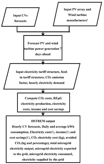 One important consideration in the creation of such a decision support tool is the fact that accurate predictions of climatic variables are required to simulate REμG power output. Several studies have been carried out regarding the prediction of climatic variables and simulation of renewable energy output power. REμG electricity consumption, electricity pricing structures, FIT structures and associated CO2 emissions have also been modeled and analyzed in previous research. Soshinskaya et al. [] utilized measured wind speed, solar irradiation and real time manufacturer’s data to model a REμG serving a water treatment plant in the Netherlands. Li et al. [] used autoregressive integrated moving average with exogenous input (ARIMAX) modeling to forecast PV power. The study showed that the forecasting accuracy of PV power output was greatly improved by the ARIMAX model when compared with an autoregressive integrated moving average model without exogenous inputs (ARIMA). Murphy et al. [] used weather predictions from the European Centre for Medium-Range Weather Forecasts (ECMWF) and corresponding onsite empirical temperature data to generate a rolling onsite temperature forecast with a one-hour resolution. This was accomplished by using a Non-linear Auto Regressive with eXogenous input (NARX) recurrent dynamic neural network model. A significant increase in localized temperature forecast accuracy was found, which enabled the optimization of cold energy storage in a smart grid environment. A model for electricity consumption on dairy farms was created by Upton et al. []. This model was used to simulate annual electricity consumption along with related CO2 emissions and electricity costs on dairy farms. The model demonstrated that moving from a day and night ET structure to a flat ET structure for a dairy farm resulted in significant electricity cost increases. Impacts of electricity pricing structures on REμGs have also been studied in [,,,,,,,,,,,,] and it has generally been found that exposing electricity consumers to variable ET structures encourages demand response and promotes demand side management. FIT policies have proven successful in the growth of renewable energy implementations [,,,,,]. Li et al. [] developed and validated energy forecasting models for a building cluster with multiple buildings and distributed energy systems, while also creating a collaborative operation framework to determine the optimal operation strategies of said building cluster. Several studies have focused on smart grids and REμGs for the purpose of reducing energy consumption, costs and carbon footprint. Stamatescu et al. [] applied a rule based control system to a microgrid under two scenarios: a domestic dwelling with low energy demand and an office building with high energy demand. In both scenarios introducing the control system resulted in improved energy efficiency and improved renewable energy utilization. Pascual et al. [] proposed an energy management strategy for a residential REμG comprised of PV panels and a wind turbine. The proposed control strategy used battery state of charge, power at each REμG node, electrical load and renewable generation forecasts as inputs. By using forecasted data and correcting any forecasting errors according to the state of the battery, the strategy resulted in a better grid power profile when compared with other state-of-the-art strategies.
