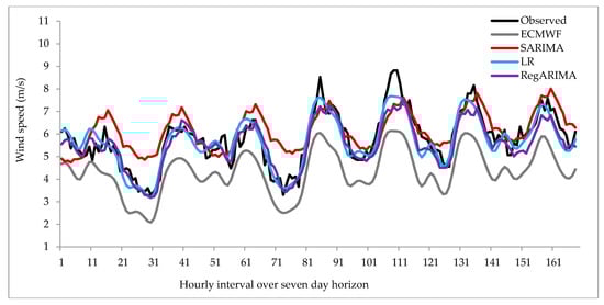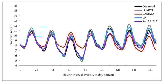 In this study, the decoded ECMWF operational forecast data were used as explanatory variables in the linear regression models and RegARIMA for the analyzed climate variables. The SARIMA models were solely developed using empirical data obtained from the CIT NBERT meteorological station. Figure 5, Figure 6 and Figure 7 show weekly forecasted climate variables from the SARIMA, LR and RegARIMA models together with the ECMWF forecast and empirically obtained data, throughout the demonstration week.