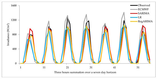The last seven days of each month were selected as the target periods for all three weather variables. Twenty-one days of preceding data were used to train the models for each weather variable. This training duration (21 days) was found to yield the optimal results. The 21 days of input data contained hourly records for each weather parameter (temperature (°C), wind speed (m/s) and irradiance (W/m2)) and the corresponding ECMWF forecast values for each parameter. Therefore, the regression models (see Section 2.2) were trained based on the forecast error of the ECMWF relative to the actual values (local empirical records) of the weather parameters at a specific time (hourly) over the preceding 21 days. This input data arrangement allowed the regression models to map the relationship between the ECMWF forecast and the actual recorded parameters at specific times of the day. Therefore, if there were reoccurring errors in the ECMWF forecast the regression models could be applied as calibration tools to reduce the magnitude of the ECMWF error. This methodology has been successfully employed in cognate studies [,,]. The DSTREM seven-day forecast was then generated by receiving the ECMWF forecast for the seven-day period and feeding this information into the regressions models to generate a calibrated forecast. In situations where ECMWF forecasts could not be obtained, actual values (local empirical records) alone were used to generate the DSTREM forecast (see Figure 1). The improvement in weather parameter prediction accuracy is displayed in Section 3.1.
