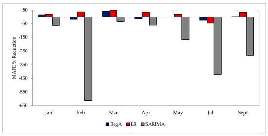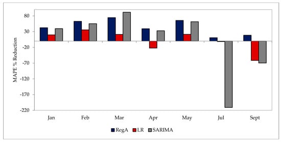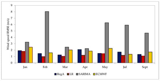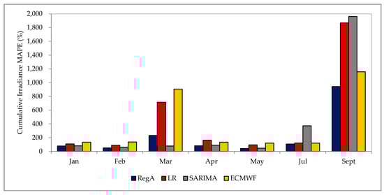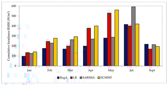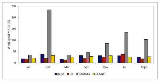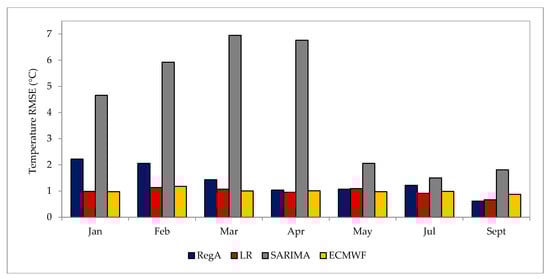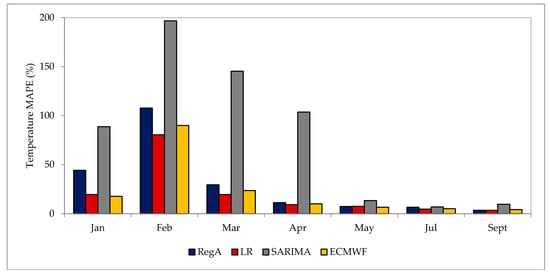 Figure 5 displays predicted and observed temperature over the demonstration week. The average performance of the models over the validation periods can be observed in Table 2, Table 3 and Table 4. Average MWE was approximately 9%, 10%, −47% and −15% for ECMWF, LR, SARIMA and RegARIMA forecasts, respectively. The average RMSE was approximately 1.4 °C, 1.0 °C, 4.2 °C and 1.0 °C for ECMWF, LR, SARIMA and RegARIMA forecasts respectively. The average MAPE was approximately; 21%, 21%, 81% and 30% for ECMWF, LR, SARIMA and RegARIMA forecasts, respectively. Monthly error erraticism for temperature can be seen in Figure 8 and Figure 9 for all the analyzed models. The SARIMA model generally had the highest prediction errors across the examined validation dataset, while the month of July had the minimum prediction errors across the analyzed models together with the ECMWF forecasts. This can be attributed to the stochastic nature of temperature in Ireland [] and the dependency of the SARIMA model on historical data. The month of July had a more consistent daily temperature, hence the model generated more accurate predictions.