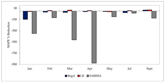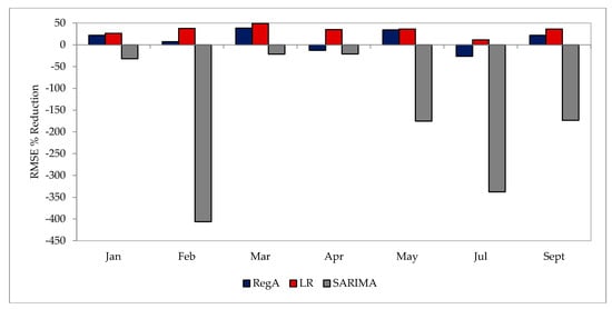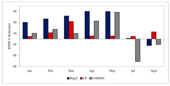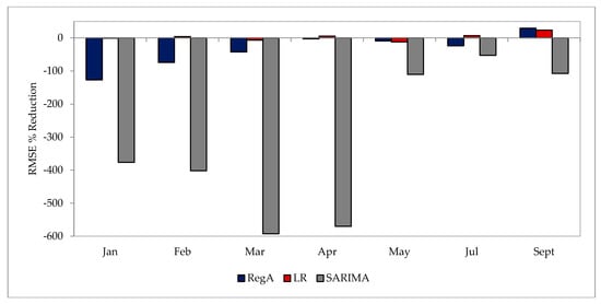 Percentage reduction of wind speed RMSE relative to ECMWF data for all forecasting models (RegA denotes RegARIMA model).