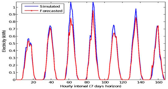 Simulated (using empirical data) and forecasted (using forecasted data) PV array power output (kWh).