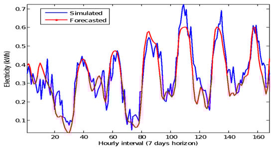 Empirical and forecast based simulations of wind turbine power output for the demonstration week, averaged across the analyzed validation dataset were 58.5 kWh and 54.9 kWh respectively. The Pearson correlation coefficient, MWE and RMSE between empirical and forecast based simulations for wind turbine power output were 0.90, −10% and 0.14 kWh respectively. The results shown for both the PV array and wind turbine power output simulations indicate that the forecast models were effective seven-day-ahead predictors, and were therefore deemed suitable for integration into DSTREM.