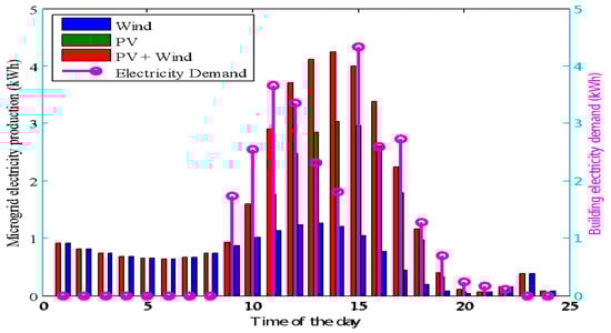 In this study, a seven-day electricity consumption profile for occupants of the NBERT located in the Zero2020 building at CIT was utilized for simulations. The NBERT contains offices and meeting rooms for lecturers, researchers, industry consultants, and visiting academics. The NBERT test-bed consists of a state of the art interior where occupants partake in a “living lab” environment for research into human dependent topics including thermal comfort and demand side management [,,,,,,]. The hourly electricity requirement of each of the building’s occupants was recorded for five working days (Monday to Friday) and two non-working days (Saturday and Sunday). Hence, all analyses were computed as a seven-day by 24hour matrix (7 × 24). The simulation results in Section 3.3 were based on a seven-day electricity usage profile that was based on recorded empirical data for each occupant of the building. The daily electricity consumption patterns for each occupant were recorded for the year 2013 through the NBERT building management system (BMS). This BMS recorded data pertaining to heating lighting, and general services within the NBERT. Furthermore, all energy-consuming appliances used by each individual occupant of the NBERT were sub-metered, including desktops, monitors, laptops, fans, kettles, air heaters, printers, speakers and coffee machines. The information gathered by the BMS was used to generate a deterministic energy usage profile for each occupant of the building based on their weekly work schedule. To calculate the combined electricity usage profile for use with DSTREM, the electricity profiles for all occupants were aggregated and added to base loads which included heating, lighting and general services. The average daily electricity requirement of the NBERT occupants was 5.51 kWh, while the total seven-day electricity requirement of the occupants was 27.67 kWh.