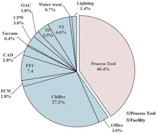 In large-scale industrial cleanrooms that have high energy demands, such as semiconductor fabrication plants, a large amount of outdoor air is introduced into the cleanroom to maintain cleanliness and a positive pressure [5]. As shown in Figure 1, generally, the energy consumed in the facility systems (e.g., air conditioning system, nitrogen plant, lighting and water treatment components) is approximately 60% of the total energy consumption in semiconductor cleanrooms and the rest is used by the tools for making semiconductor products [6].