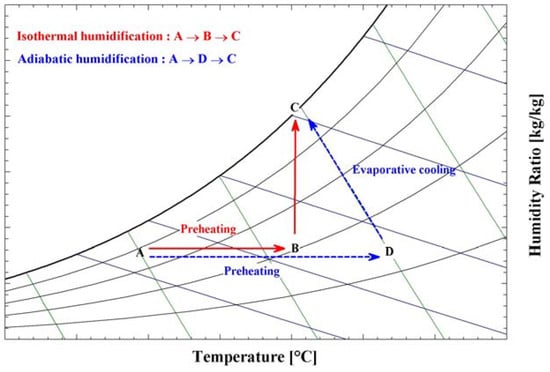In the case of isothermal humidification using water vapor, the humidification process exhibits an almost vertical line on the psychrometric diagram. However, in adiabatic humidification, the air is humidified till the saturation curve along the isenthalpic line or the wet bulb temperature line [15]. In addition, in this process, the air is humidified and cooled simultaneously through evaporative cooling. A diagram of the psychrometric process for both methods is shown in Figure 2. To humidify the air to the set-point condition, the air follows the path from D to C for adiabatic humidification and from B to C for isothermal humidification. As seen in Figure 2, the air is to be heated by external energy before humidification for both isothermal and adiabatic humidification from A to B and from A to D, respectively.