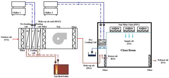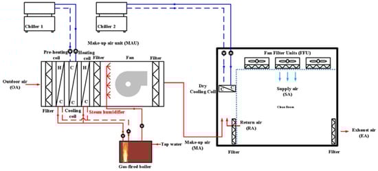 Cleanrooms are special spaces that maintain the controlled environments required for the manufacture of certain products [1]. In most cleanrooms, ISO standards for cleanliness are applied depending, on the size of the particles that affect the products [2]. To maintain a specified cleanliness level, the concentration of airborne particles and microorganisms in the air are controlled to within a target set-point. In addition, cleanrooms require precise control of environmental conditions such as temperature, humidity, and pressure, depending on the production requirements of the particular products [3,4].