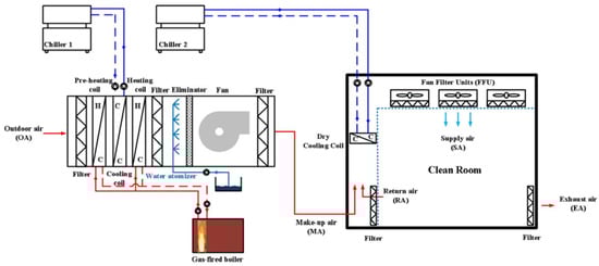 For CASE 2, the direct-injection steam humidifier in CASE 1 is substituted by a pressurized water atomizer for the adiabatic humidification method (Figure 4). According to the research of Chaker et al. [27], pressurized water atomizers are composed of a high-pressure pump and pin nozzle for humidification. The water is ejected from the orifice at a high velocity using a high-pressure pump that then collides with the pin nozzle resulting in the water being atomized into the air as a thin conical sheet of water [28]. Also, when used in the MAU, the pressurized water atomizer injects the water in the form of fine water droplets (of 10 μm diameters) into the air because the droplets must evaporate before passing through the fan of MAU [9]. The pressurized water atomizer does not need the boiler for generating the steam vapor when humidifying the air to achieve same humidification performance of the system used in CASE 1 [21]. Figure 4 shows the configuration of the HVAC system for CASE 2. The components of the MAU for CASE 2 are arranged in the following order: first is the preheating coil followed by the cooling coil, heating coil, and pressurized water atomizer. To humidify the air while simultaneously preventing dehumidification by the cooling coil, the pressurized water atomizer is placed towards the downstream end in the MAU (i.e., after the cooling coil). Additionally, an eliminator is required in the MAU to prevent the water from scattering. Like CASE 1, a boiler for supplying hot water to preheating coil is required for humidification. Low and high temperature chillers are used to supply chilled water (at 6 °C and 14 °C, respectively) to the cooling coil and DCC, which are installed in the return duct, for dehumidification and sensible cooling, respectively. There are 10 MAUs and a set of 7270 FFUs, with each unit having an airflow capacity of 100,000 m3/h and 900 m3/h, respectively.