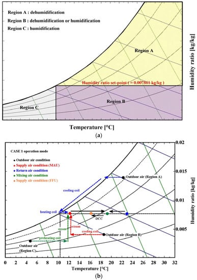 - Region C: During the winter season, the outdoor air is very dry and cold. Therefore, to humidify the process air to the set-point humidity condition, it is necessary to heat the outdoor air using a preheating coil before passing it through the humidifier. In CASE 1, it is necessary to preheat the outdoor air with a heating coil up to the dew point temperature (10.3 °C) of the supply air set-point. Therefore, the outdoor air is first heated to the dew point temperature of the cleanroom by the preheating coil and then humidified by the direct-injection steam humidifier in the MAU. Then, the air is supplied to the cleanroom through the DCC and FFU in order to maintain the set-point environment of the cleanroom. In CASE 2, which uses a pressurized water atomizer installed in the MAU, the preheating coil activates once the temperature of the outdoor air was too low. When humidifying using a pressurized water atomizer, more preheating coil load is generated than in CASE 1 because the air is humidified along the wet bulb temperature line of the humidifier line in the psychometric chart. The air supplied from the MAU is mixed with the recirculation air in the return duct and the DCC operates depending on the cooling load of the cleanroom. Finally, the pressurized water atomizer is installed upstream of the DCC in the return duct such that only the MAU controls the temperature of the process air in order to meet the MAU set-point temperature, just as in CASE 1. As a result, the preheating load is identical to that in CASE 1 because the recirculation air is mixed with the air supplied from the MAU in the return duct. Then the pressurized water atomizer installed upstream of the DCC activates to humidify the air supplied to the cleanroom in order to maintain the set-point humidity ratio of the cleanroom. When operating the pressurized water atomizer, the air temperature is decreased by the cooling effect of the adiabatic humidification. If the resulting evaporative cooled air cannot meet the cooling load of the cleanroom, the DCC then activates.
