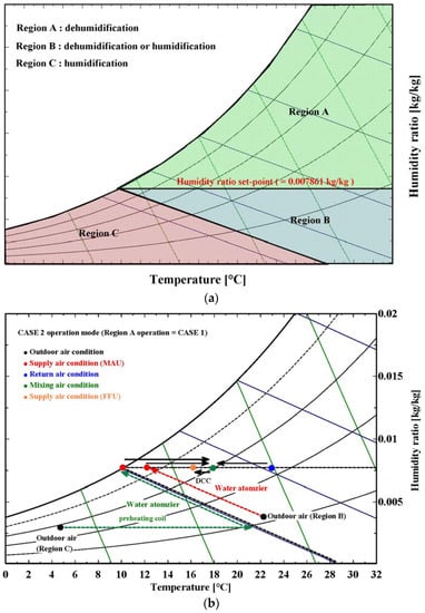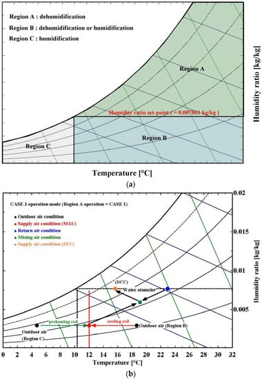 - Region B: In Region B, a humidification device is required in order to humidify the outdoor air up to the set-point humidity ratio. In CASE 1, the air is cooled or heated by cooling or heating coils to maintain the set-point supply air conditions (12 °C DB, 90% RH) because the humidification process using the steam humidifier is an isothermal process, as shown in the psychrometric chart in Figure 6a. The air is passed through the MAU and treated using the DCC. The air is then supplied to the clean room by the FFU similar to as in the Region A operation. As shown in Figure 7b and Figure 8b, CASE 2 and CASE 3 uses the pressurized water atomizer in the MAU and return duct, respectively, for humidification instead of a direct-injection steam humidifier. In the psychrometric chart, the humidification process is an adiabatic process, the process through the pressurized water atomizer follows a constant wet-bulb temperature line. In CASE 2, the supply air temperature is not constant at the set-point values due to pressurized water atomizer being installed downstream of the MAU. Therefore, depending on the amount of water required for humidification, the cooled air from the evaporative cooling process is mixed with the recirculated air in the return duct and then sensibly cooled by the DCC in order to meet the cooling load of the cleanroom. However, in CASE 3, since the MAU does not have a humidifier, the MAU only controls the air temperature supplied to it from the return duct. The air supplied from the MAU mixes with the recirculated air in the return duct while the pressurized water atomizer operates to maintain the set-point humidity ratio of the cleanroom. If the cooling effect on the air due to the adiabatic humidification cannot meet the indoor cooling load, the DCC will activate to maintain the set-point temperature of the cleanroom (Figure 8b).