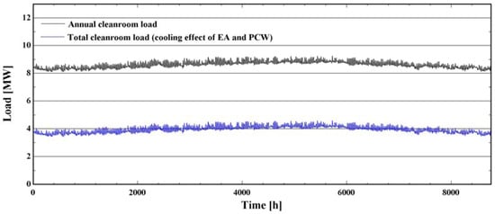 The cooling load of the semiconductor cleanroom is simulated using a transient system simulation tool (TRNSYS 17) [35] and the energy consumption of different HVAC systems in operation are evaluated using a commercial engineering equation solver (EES) [36]. Figure 9 shows the annual cooling load of the cleanroom according to Seoul weather data from IWEC. Due to the large heating load generated by the equipment and fan, the HVAC system operates for treating the cooling load all year round to maintain the set-point air condition in the cleanroom. In Figure 9, the black lines represent the total cooling load of the cleanroom while the blue lines represent the cooling load of that considering the cooling effects of the exhaust air and the PCW. According to the results, and considering the cooling effects of the exhaust air and the PCW, the cooling load of the semiconductor cleanroom is reduced by about 50%, resulting in a load similar to that expressed by the blue line.