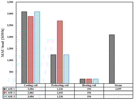 Figure 10 and Figure 11 show the annual operating load in the MAUs and in the overall HVAC system. The operating load of each MAU is sub-divided by the loads on the cooling, preheating, electric heating coils as well as by the steam load for humidification.