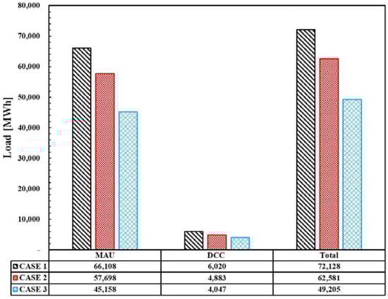 HVAC system loads according to the different cases are shown in Figure 11. CASE 1 and CASE 3 show the largest and smallest load in the MAU, respectively. In regard to the DCC load, due to the evaporative cooling effect of adiabatic humidification, CASE 2 and CASE 3 exhibit a decrease of 19% and 33%, respectively, as compared to CASE 1. In addition, CASE 3 with the pressurized water atomizer in the return duct results in a DCC load less than that of CASE 2, which employs a pressurized water atomizer in the MAU. When humidifying by adiabatic humidification method, A greater evaporative cooling effect of CASE 3 compared to CASE 2 due to the airflow to be evaporative cooled more than CASE 2. Therefore, CASE 1 shows the largest total load for the overall HVAC system. CASE 2 and CASE 3, both of which uses a pressurized water atomizer, shows a load reduction of 13% and 32%, respectively, as compared to CASE 1. As a result, water atomizers in cleanroom HVAC systems are expected to reduce energy consumption as to conventional steam humidifiers.