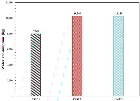 On the other hand, when using direct-injection steam humidifiers and pressured water atomizers for humidifying the air, the amount of required water according to the humidification methods is estimated from different humidification efficiency. Therefore, as shown in Figure 12, due to the lower humidification efficiency of the pressurized water atomizer as compared to that of direct-injection steam humidifiers, the amount of water required for CASE 2 and CASE 3 using the water atomizer is increased by 29% as compared to CASE 1 using the steam humidifier.