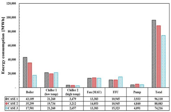 Figure 13 shows the energy consumption for the overall HVAC system to maintain the indoor environment of the cleanroom for each case. The components of the entire HVAC system are as follows: a boiler, low temperature chiller, high temperature chiller, fan, FFU, and pump. Additionally, for comparing the energy consumption of HVAC systems, the primary energy conversion factors of electricity and gas were adopted as 2.75 and 1.1 respectively [37].