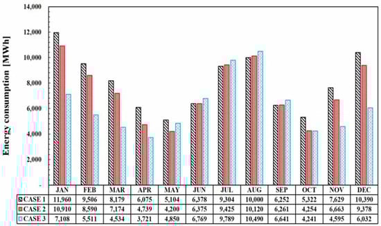 The chiller energy is consumed by the low-temperature chiller, which supplied low-temperature chilled water to the cooling coil of the MAU, and the high-temperature chiller, which supplied the DCC with relatively high-temperature chilled water. Depending on operating mode of the MAU for each case, the energy consumed by the low-temperature chiller in both CASE 1 and CASE 3 is equivalent. However, in CASE 2, only the pressurized water atomizer operates when the outdoor air condition is included in Region B. Therefore, the low-temperature chiller energy consumption of CASE 2 shows a 7% savings in energy consumption as compared to other cases. The operating energy of the high temperature chiller is the lowest in CASE 3, which employs a pressurized water atomizer in the return duct, due to the evaporative cooling effect of the adiabatic humidification. The DCC load is reduced during the humidification process when the pressurized water atomizer is located in front of the DCC. On the other hand, in CASE 2, when the outdoor air condition is located in Region B, only the pressurized water atomizer operates in the MAU. The supply air temperature in the MAU changes depending on the amount of humidification from evaporative cooling. Accordingly, the air temperature passing through the MAU is higher than the set-point temperature (i.e., 12 °C). Therefore, the DCC load is increased when operating in Region B. However, when the outdoor air condition is in Region C, the air is supplied to the return duct shaft at the dew-point temperature (i.e., 10.4 °C), which is lower than the MAU set-point temperature. The high-temperature chiller load in CASE 2 is reduced, as compared to CASE 1. CASE 2 and CASE 3 exhibit an 8% and 24% reduction in the energy consumption of the high-temperature chiller, respectively, as compared to CASE 1.