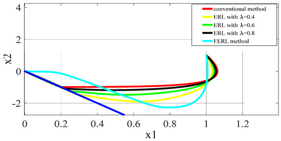 We employ both the ERL- and the FERL-based SMC simultaneously in controlling the nonlinear system. The switching surface is and the parameters in Equation (11) are: , , . Meanwhile, three different values of λ are adopted in order to see how the approaching trajectory changes with λ. The state vector initial value is [11]. The reaching trajectories of both methods are shown in Figure 2 and Figure 3. The iteration times for the ERL method are 3.986 s, 4.178 s and 4.659 s, and the iteration time for the FERL method is 3.652 s.