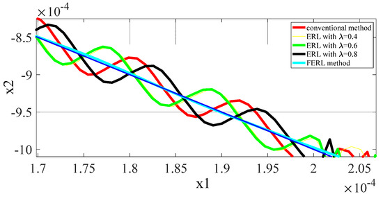One important phenomenon we can observe from Figure 2 is that the first intersection point of the FERL method is closer to the equilibrium, hence, the system experiences a shorter chattering stage, which is also one of the major strengths of the FERL method. Meanwhile, we can see from Figure 3 that the chattering level of the FERL method near the switching surface is much smaller than that of the other methods. Thus, the proposed FERL method has better performance in reaching speed and chattering phenomenon elimination.