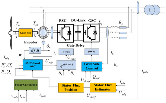 Control diagram of DFIG-based wind energy conversion system (WECS) with the sliding mode control (SMC)-based direct power control (DPC) approach.