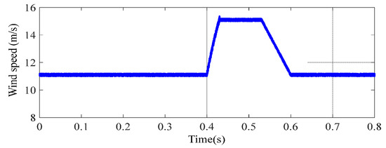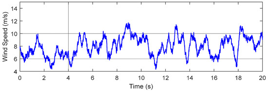 In order to test the performance of the proposed method in maximum power extraction, dc-link voltage and reactive power control, the simulation is conducted under the variable wind speed (VWS) scenario. VWS is capable of simulating the actual operation situation of a practical wind turbine. Adopting the modeling approach proposed in [49], the simulated VWS is shown in Figure 10. Before t = 2 s, the wind speed is stabilized at v = 11 m/s. The VWS starts at t = 2 s and changes randomly until t = 20 s