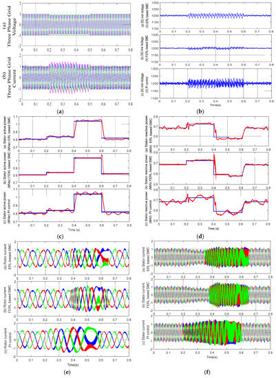 Simulation results with grid voltage drop/gust wind comparing three different approaches: (a) three phase grid voltage and current; (b) DC-link voltages; (c) Stator active power performances; (d) Stator reactive power performances; (e) Rotor currents; (f) Stator currents).