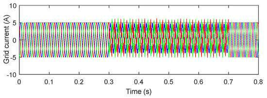 A more severe fault scenario is simulated to further test the performance of the proposed method, where a single to ground fault with 40% dip depth, a 20% of the 5th and 20% of the 7th order harmonics together with 30% of reduction of the parameters , , and are initialized in between 0.3 s and 0.7 s. Figure 8 shows the grid current in the grid fault condition.