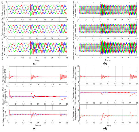 Figure 9 shows the simulation results of the ERL- and FERL-based SMC, and the PI control. It can be seen by Figure 9 that the rotor/stator currents and the active/reactive tracking performance of all the three methods are impacted by the grid fault. However, with the FERL method, the influences are smaller and the active/reactive power outputs track better than that of the ERL method. Meanwhile, Figure 9a,b reveals that the SMC approaches have better robustness capability than the PI control. When the grid fault occurs, the rotor and stator currents of the PI control experienced higher impacts than that of the SMC approaches. Meanwhile, Figure 9c–e reveals that the conventional SMC approach shows its weakness in chattering phenomena, while the novel SMC approach largely mitigated the chatter.