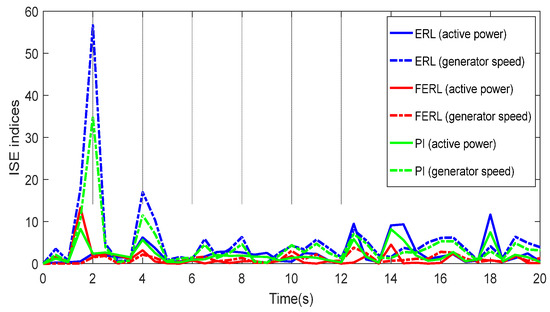 Figure 11 represents the maximum power extraction and dc-voltage support under variable wind speed with the conventional ERL method, the proposed FERL method and the PI control. Figure 11a illustrates the generator reference speed and the actual speed. Figure 11b shows the system power outputs and the corresponding maximum power. Figure 11c denotes the dc-link voltage. Comparing the figures in Figure 11a, although there is no apparent difference in the tracking performance of all the methods, it is evident that less chattering exists in the curve of the actual speed with the FERL method than that of the ERL method. Meanwhile, Figure 11b also evidences the superior performance of the proposed method in active power tracking and dc-voltage maintenance when comparing with the simulation results of the other methods. Figure 12 shows the ISE indices of the three methods in different time periods. The ISE indices are calculated every 0.5 s in order to show the tendency of tracking. Obviously, FERL-based SMC has smaller ISE indices than the ERL method and the PI control, and the ISE indices is stabilized in the entire time range.